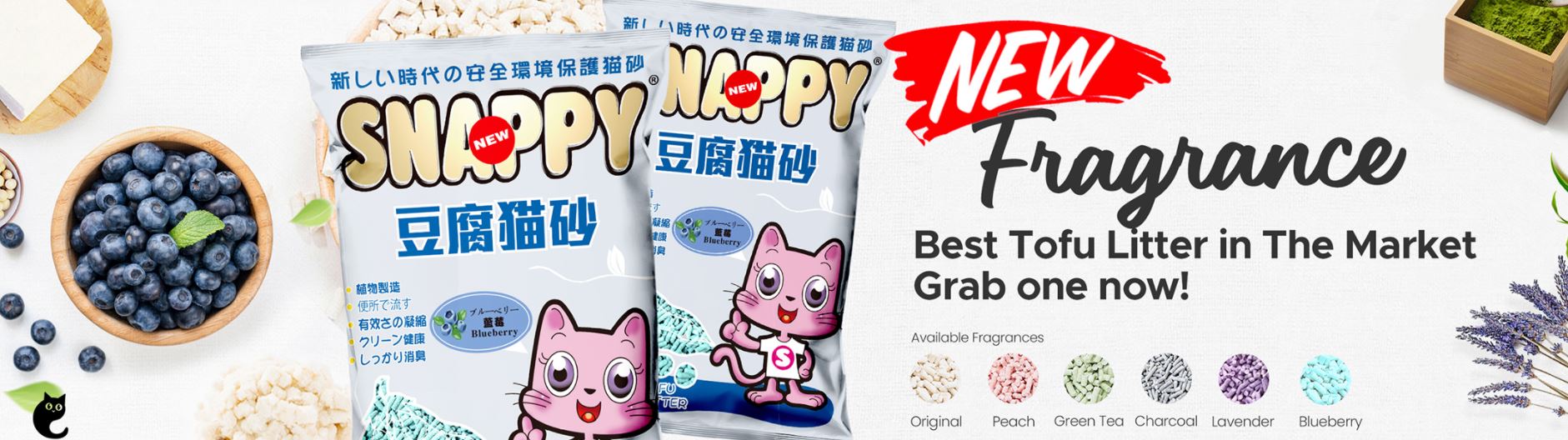Snappy Cat Tofu Litter is now available in Blueberry fragrance! Made from all natural and biodegradable materials, it is an exceptional clumping litter with superior odour control and two times more absorbent capacity than conventional clay formulas. Plus, it is completely safe and paw friendly for felines!