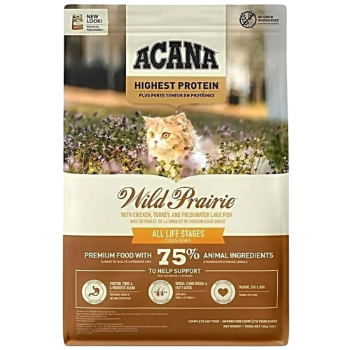 Loaded with free-run chicken & turkey, cage-free eggs, and wild-caught fish that are delivered to our kitchen in WholePrey ratios, ACANA Wild Prairie is brimming with natural goodness.
