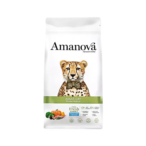 Amanova Adult Cat Divine Rabbit is an exclusive recipe for natural cat food, without cereals, without meat meals or dehydrated meats, contains minerals, dietary fibers and special ingredients such as psyllium, probiotics, pumpkin and fish oil that will help improve function kidney,digestion and prevent the formation of hairballs.
