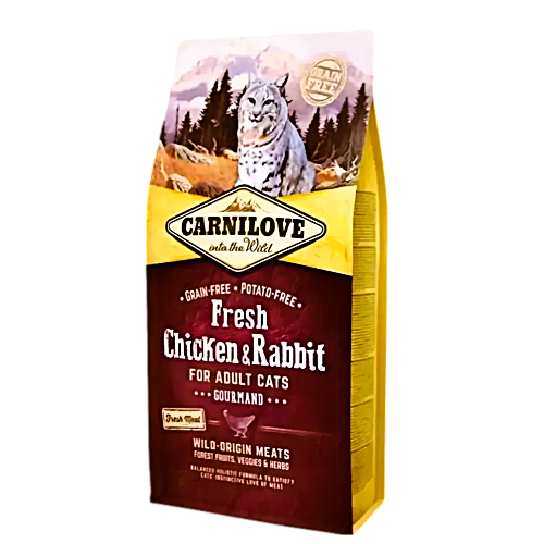 Unique and independent creatures, cats are meat eaters, full-blooded predators whoseway of life is determined by a strong hunting instinct. Carnilove Fresh Chicken & Rabbit has been formulated with respect for the laws of nature and provides your feline companion with balanced nutrition rich in fresh meat combined with a variety of vegetables, berries and herbs. Returning to a natural diet supports healthy digestion and helps maintain optimal physical condition. Bursting with flavor, the top-quality natural ingredients are irresistible to even the choosiest of feline gourmands.