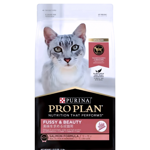 Purina PRO PLAN ADULT CAT, FUSSY & BEAUTY, SALMON is formulated with nutrients, Omega 3 and 6 fatty acids and high protein for a beautiful, soft and lustrous coat. With highly digestible ingredients and selected protein sources, it helps to support food tolerance of your cat. It also contains guaranteed live probiotics to support digestive and immune health. Furthermore, taste is not compromised with the use of high-quality ingredients to suit your cat’s palate.