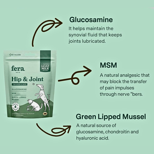 Introducing Fera’s Goat Milk Toppers for dogs and cats, each designed for extra healthy deliciousness. With Goat Milk as the #1 ingredient, these meal toppers are great for picky eaters, because pets love the cheesy smell and appetizing taste. It’s the easy (and yummy) way to level up your pet’s daily meals! Our Goat Milk HIP & JOINT formula features whole cream goat’s milk for irresistible flavor, combined with glucosamine, MSM and green-lipped mussel—three natural ingredients designed to support healthier joints.