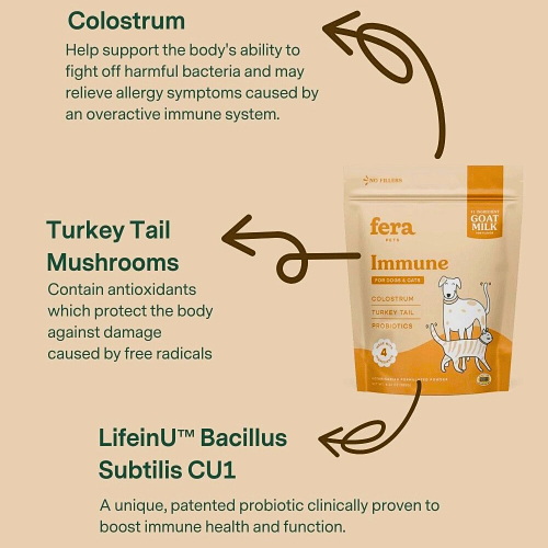 Introducing Fera’s Goat Milk Toppers for dogs and cats, each designed for extra healthy deliciousness. With Goat Milk as the #1 ingredient, these meal toppers are great for picky eaters, because pets love the cheesy smell and appetizing taste. It’s the easy (and yummy) way to level up your pet’s daily meals! Our Goat Milk IMMUNE formula features whole cream goat’s milk for irresistible flavor, combined with natural herbs and probiotics that a healthy immune system.