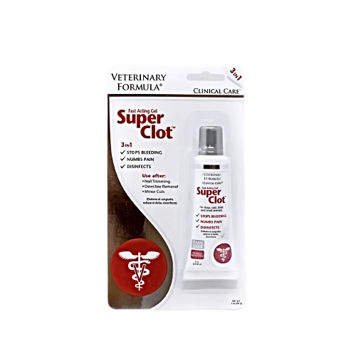 Super Clot halts bleeding that is associated with minor cuts, tail docking, ear cropping, nail trimming and dew claw removal. It comes in an easy to use applicator that provides controlled and accurate application. Super Clot is used in place of styptic powders and pencils that don’t have its disinfecting and numbing properties nor its ease of use.