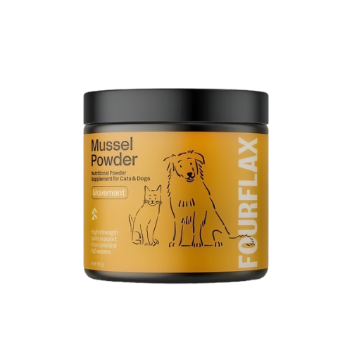 From our family to yours, Fourflax Mussel Powder is a natural, effective joint supplement made from dried New Zealand green-lipped mussels, harvested in the Marlborough Sounds. Renowned for its high levels of Glycosaminoglycans, it promotes flexibility, elasticity, and cartilage strength. Rich in protein, glucosamine, chondroitin, vitamins, antioxidants, and essential fatty acids, this sprinkle supports your pet's mobility and overall wellbeing. Ingredients: 100% natural dried green-lipped mussel powder.