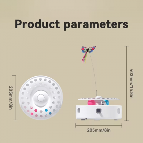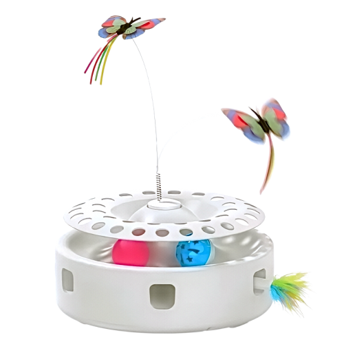 Shooting feather from random holes, flying butterfly and balls in the track. The fluffy feather keeps hiding and popping out from random holes, unpredictable movement stimulates cats to swat and play like a whack-a-mole game. Lifelike butterfly that flaps around in the air like real easily prompts cats to pounce and bat. The balls which you can put in the track add extra fun when cats stick their claws into the track and bat the balls