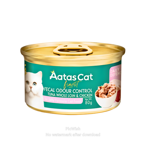 Aatas Cat Finest Daily Defence Fecal Odour Control is a purr-fect blend of tuna whole loin and succulent shreds of chicken that have been slow-cooked and simmered in delicious, savory jelly. This specially crafted recipe contains FOS (Fructooligosaccharide) and natural fibres to help support optimal digestive function and promote healthy bowel movement. FOS is a natural occurring prebiotic, which helps boost the growth of healthy intestinal bacteria and create balance in sensitive stomachs, while natural fibre helps to regulate the digestive system. Both ingredients aid in the prevention of digestive disorders in the gastrointestinal tract which may cause unpleasant fecal odour. Each meal serves to provide your little one with impeccable dining enjoyment while ensuring that they daily health needs are well taken care of.
