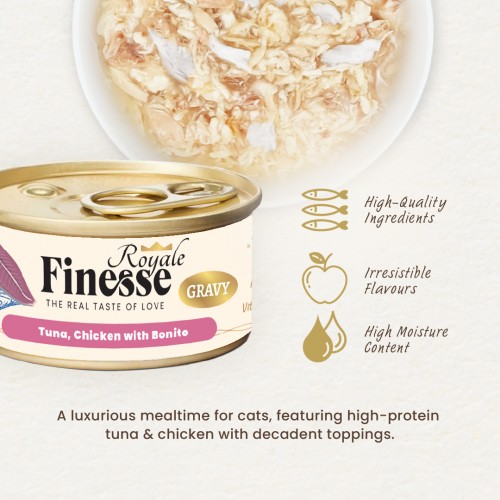 Finesse Royale grain-free wet food is crafted with the finest cuts of tuna and chicken, paired with decadent toppings like fish roe, scallops, clams, and lobster. This luxurious blend is guaranteed to deliver a rich and satisfying mealtime experience for all discerning feline friends.